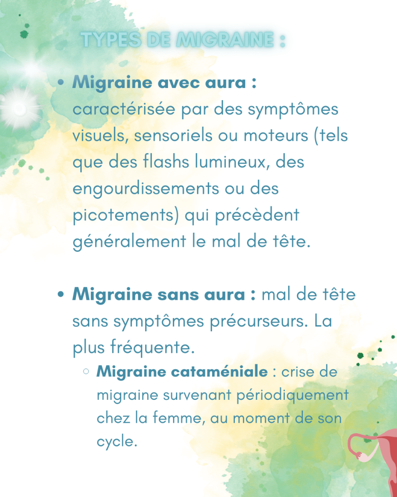 - Migraine avec aura : caractérisée par des symptômes visuels, sensoriels ou moteurs (tels que des flashs lumineux, des engourdissements ou des picotements) qui précèdent généralement le mal de tête.