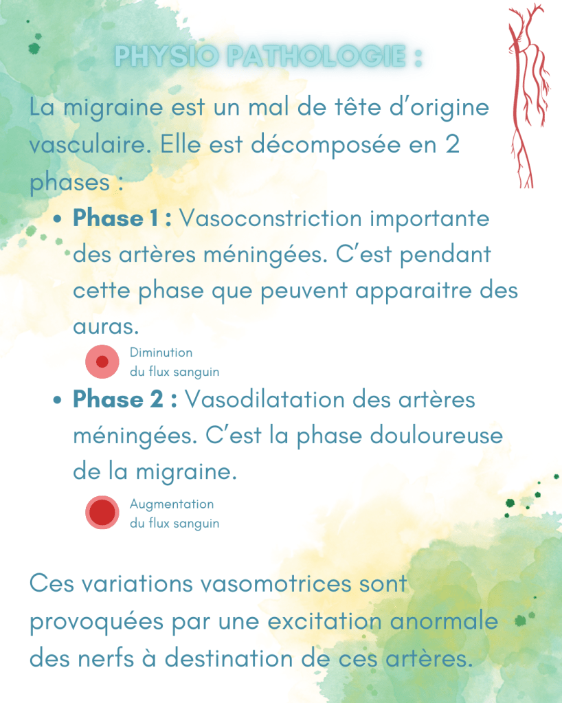 La migraine est un mal de tête d’origine vasculaire. Elle est décomposée en 2 phases :