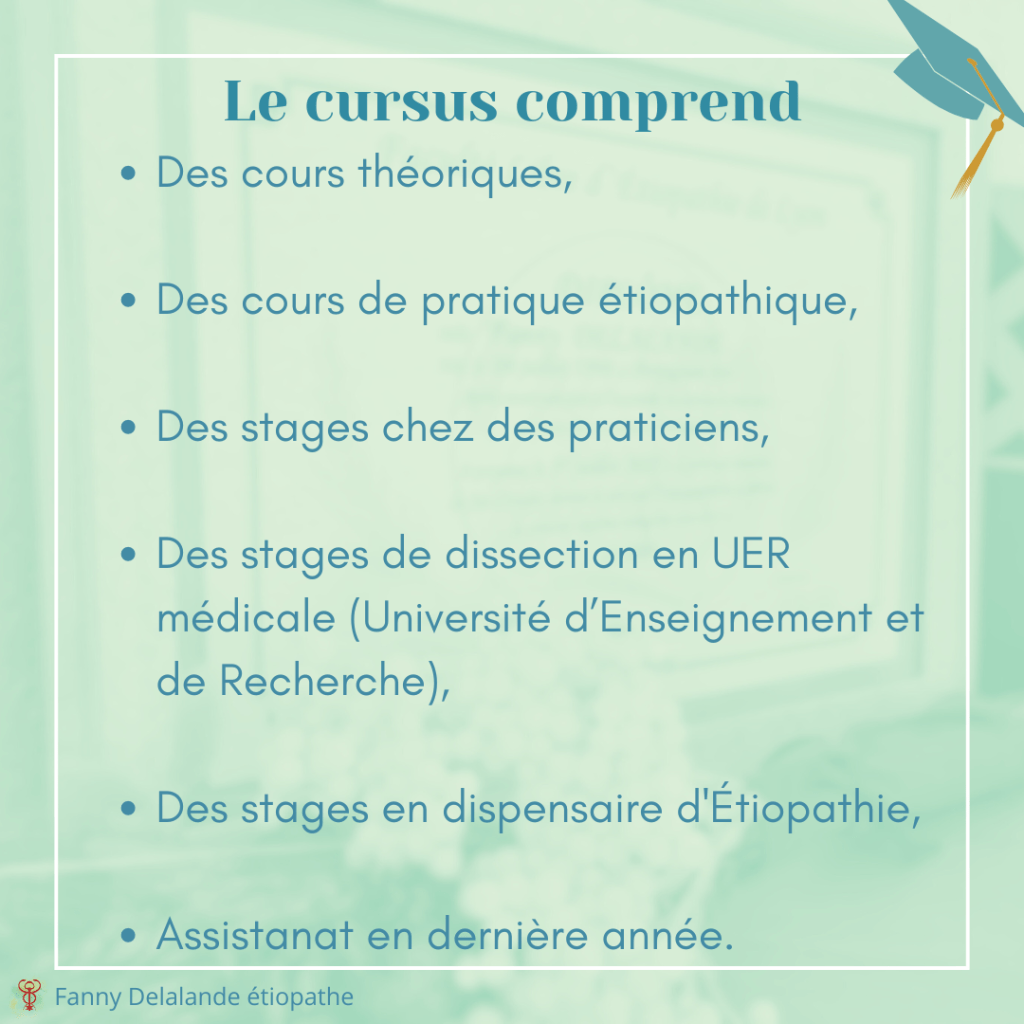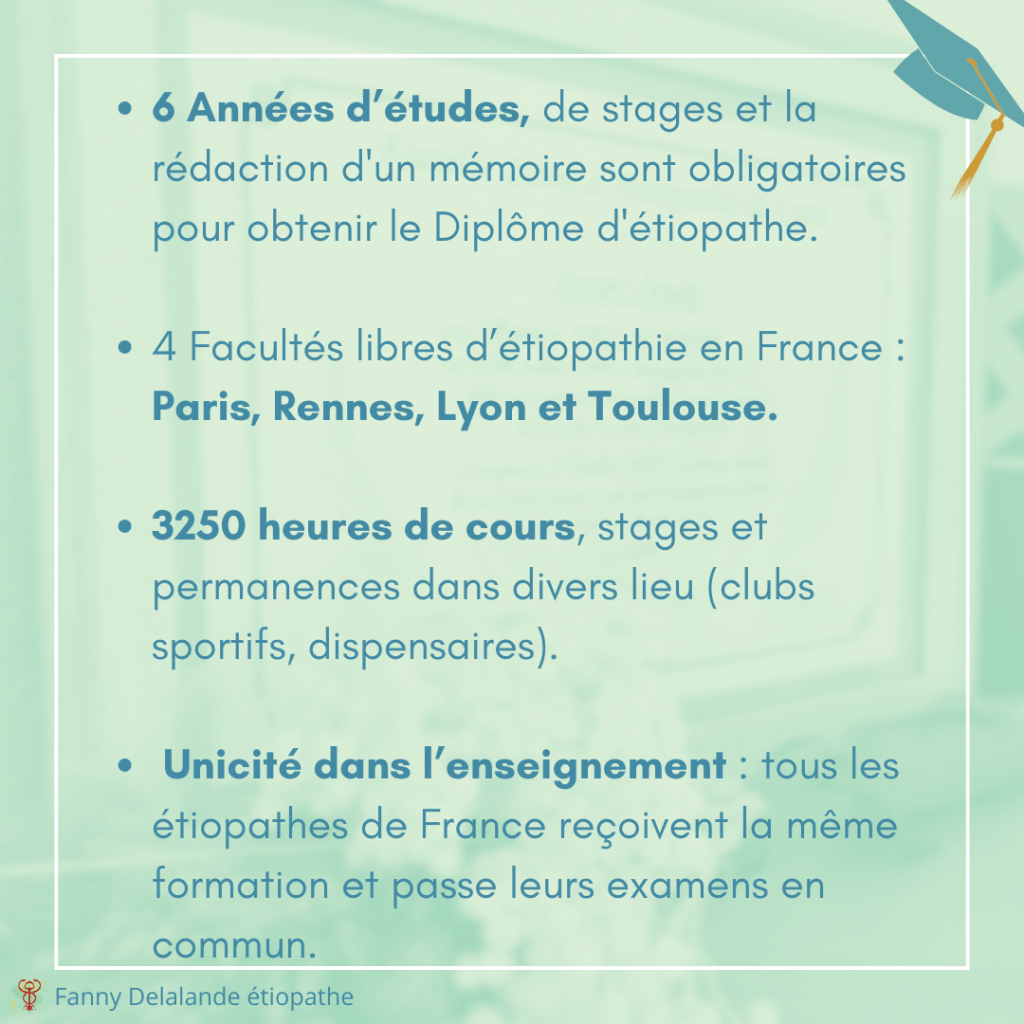 - 6 Années d’études, de stages et la rédaction d’un mémoire sont obligatoires pour obtenir le Diplôme d’étiopathe.