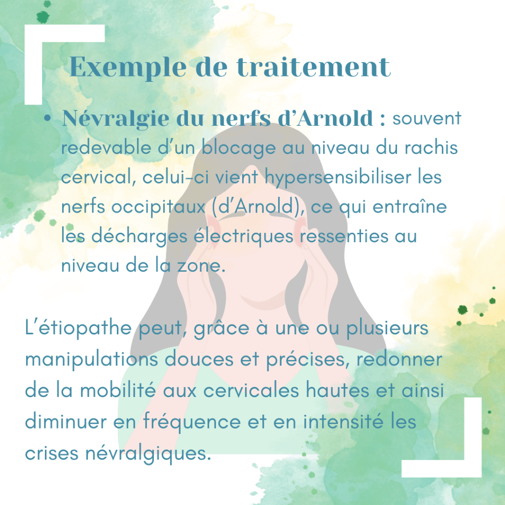 L’étiopathe peut, grâce à une ou plusieurs manipulations douces et précises, redonner de la mobilité aux cervicales hautes et ainsi diminuer en fréquence et en intensité les crises névralgiques.