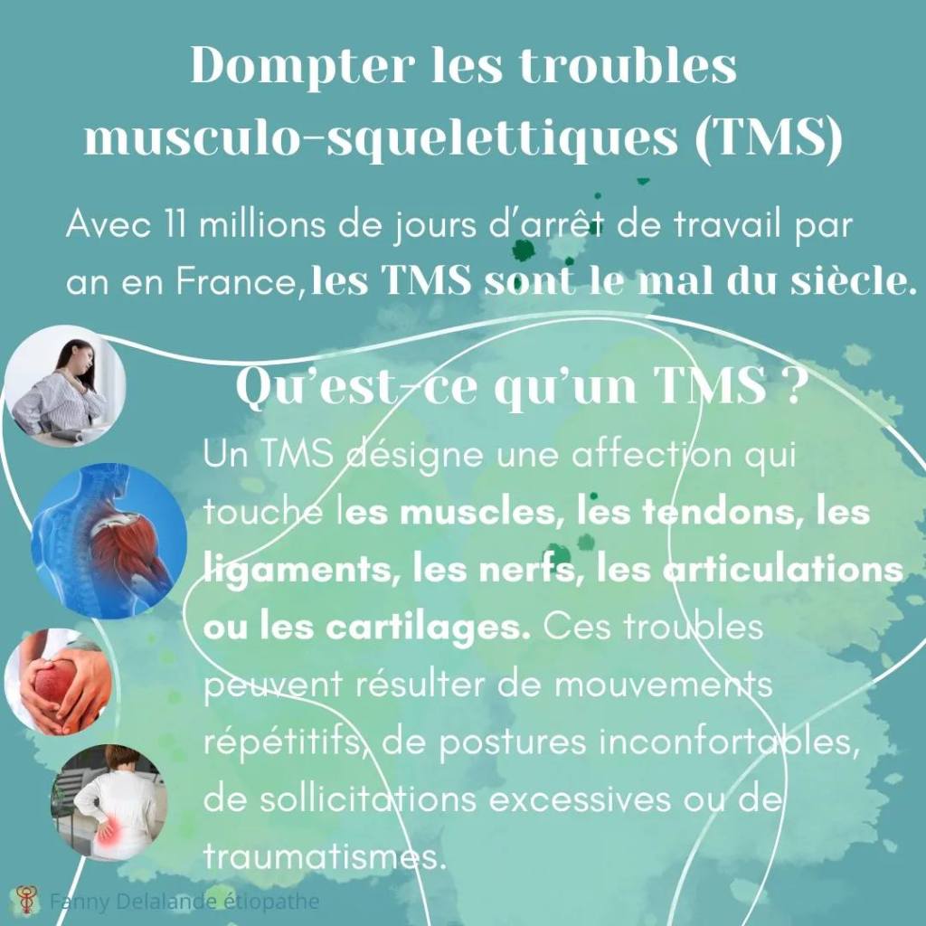 Un TMS désigne une affection qui touche les muscles, les tendons, les ligaments, les nerfs, les articulations ou les cartilages. Ces troubles peuvent résulter de mouvements répétitifs, de postures inconfortables, de sollicitations excessives ou de traumatismes. Les TMS se manifestent souvent par des douleurs, des raideurs, des engourdissements, une diminution de la force musculaire ou une limitation des mouvements.