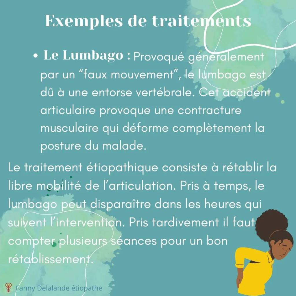 Le traitement étiopathique consiste à rétablir la libre mobilité de l’articulation. Pris à temps, le lumbago peut disparaître dans les heures qui suivent l’intervention. Pris tardivement il faut compter plusieurs séances pour un bon rétablissement.