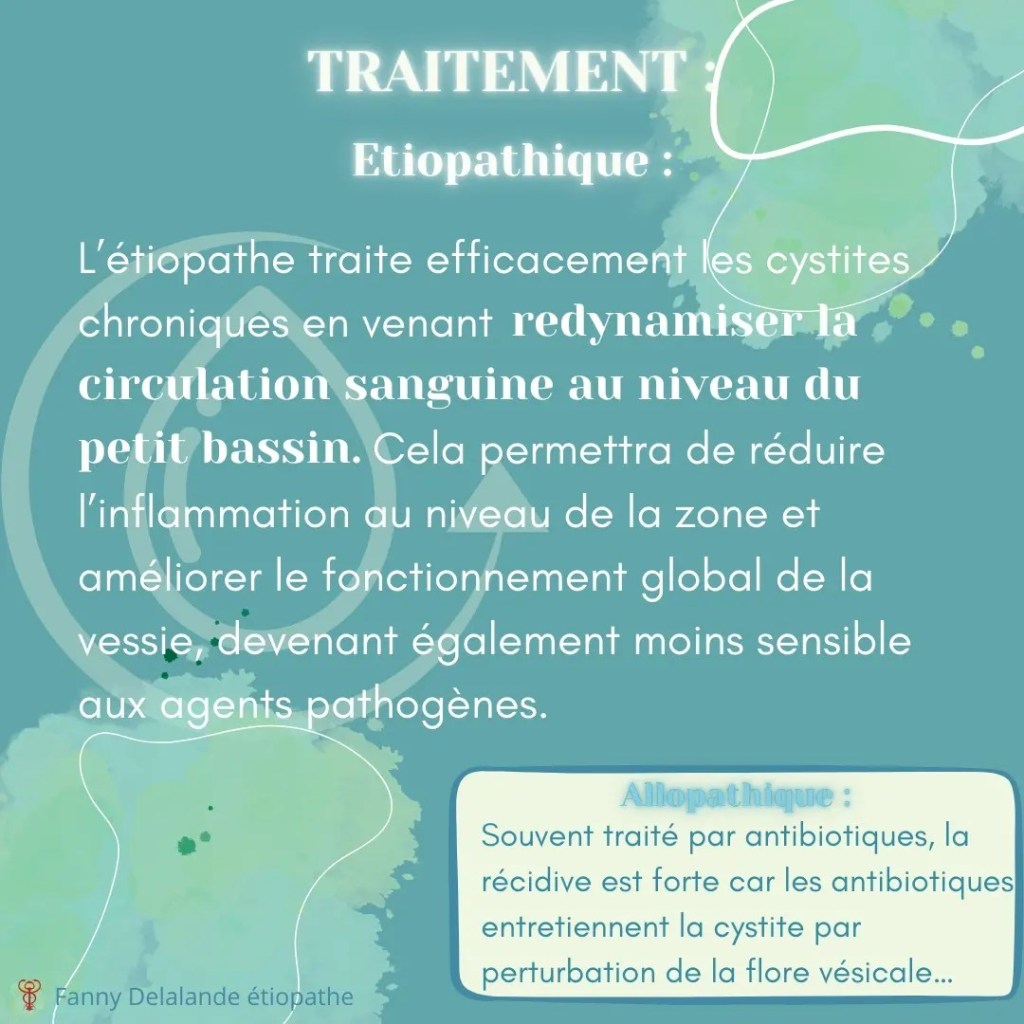 L’étiopathe traite efficacement les cystites chroniques en venant redynamiser la circulation sanguine au niveau du petit bassin. Cela permettra de réduire l’inflammation au niveau de la zone et améliorer le fonctionnement global de la vessie, devenant également moins sensible aux agents pathogènes.